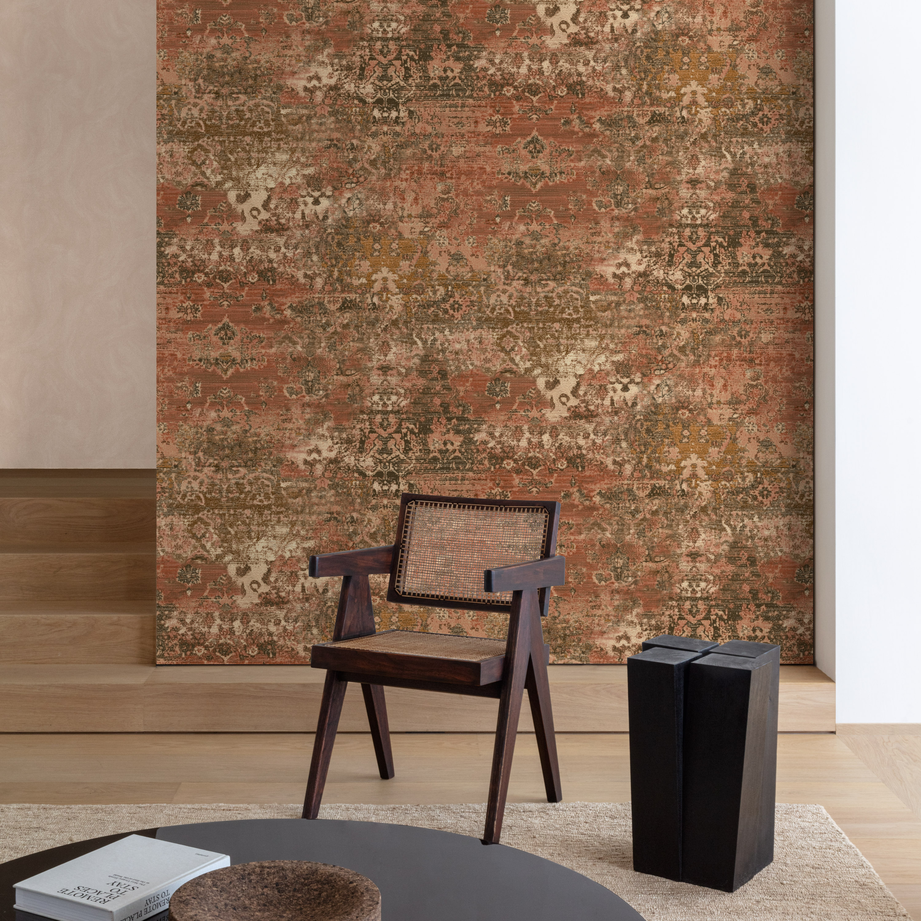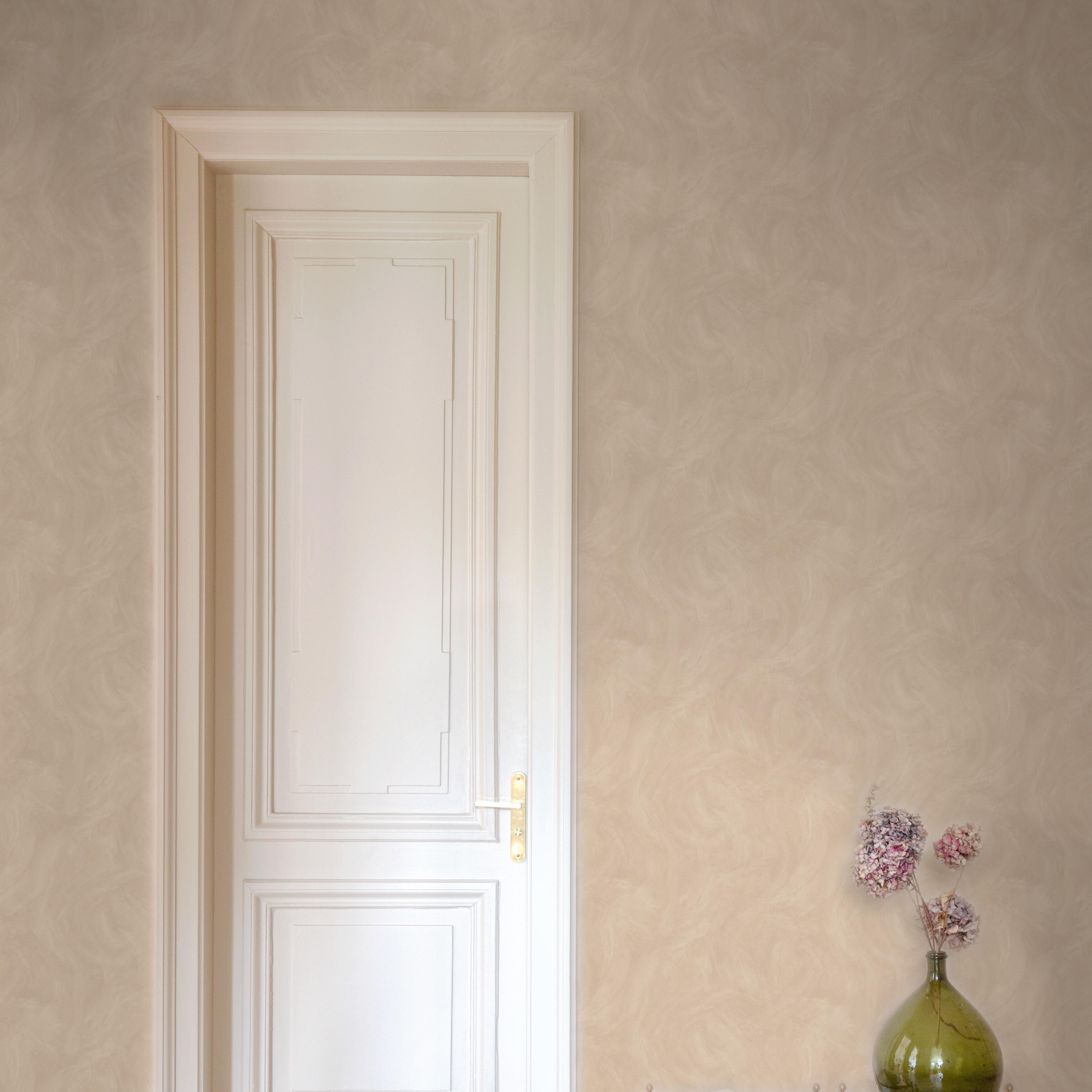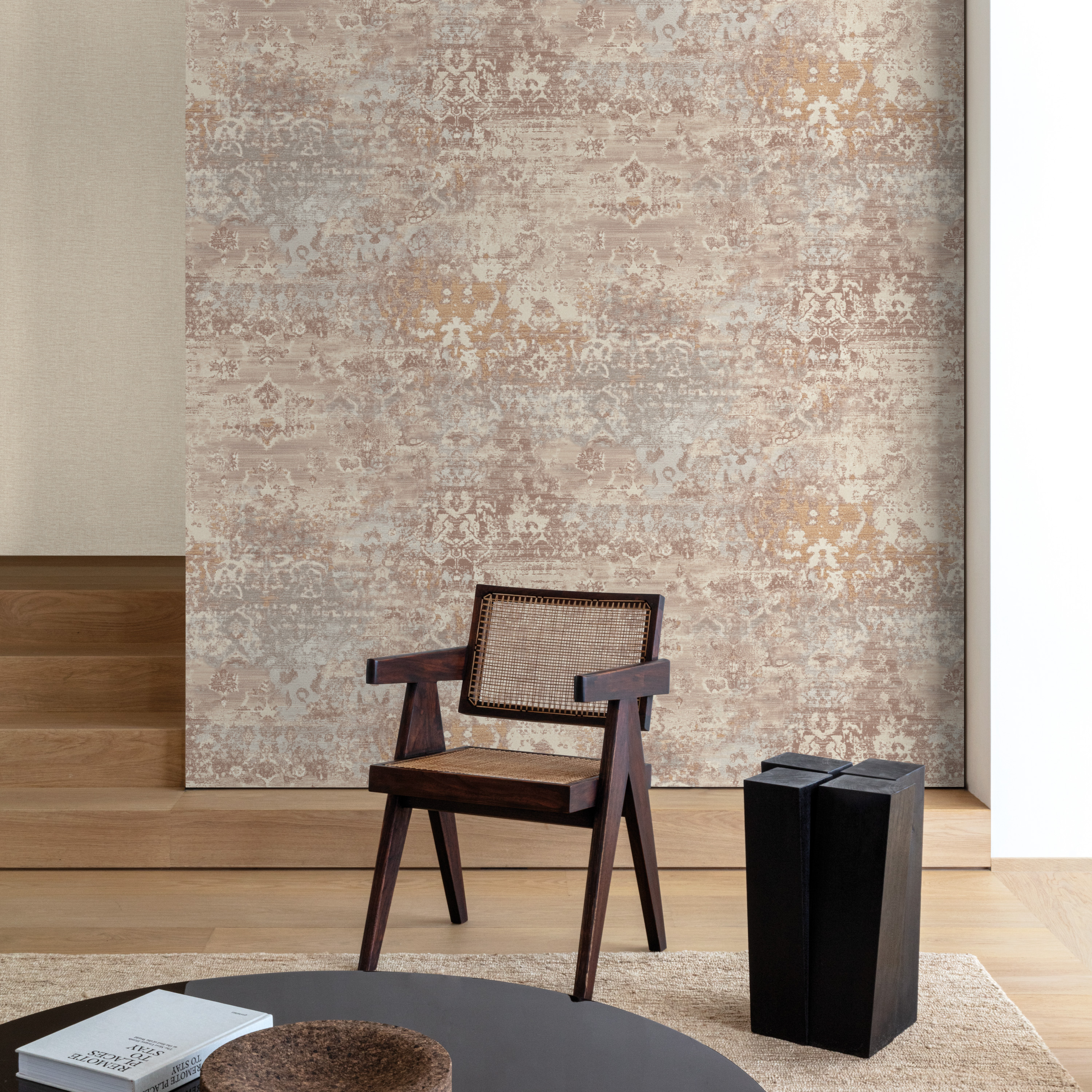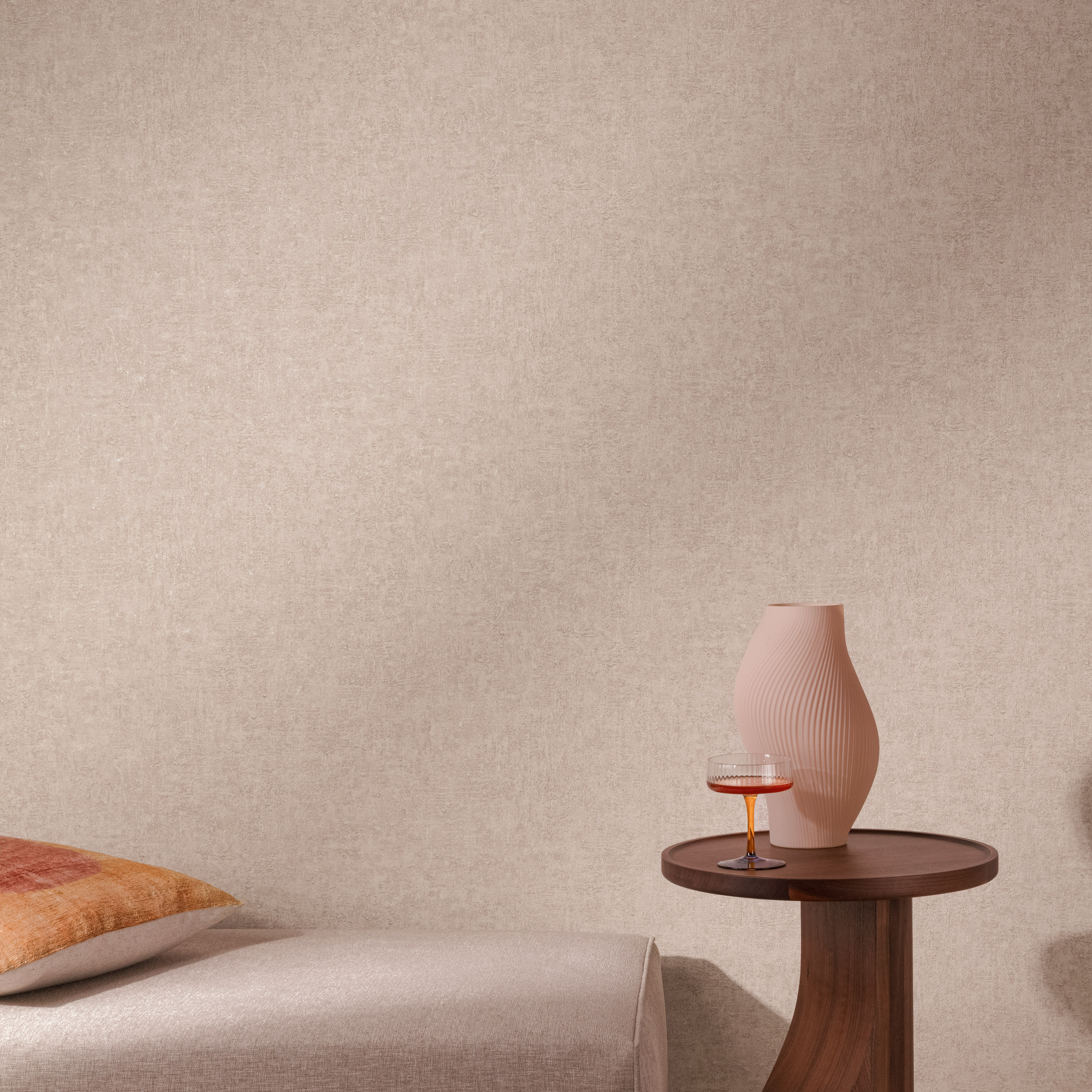 Дополняет эту группу мотив с имитацией штукатурки — спокойный, тактильный и предельно естественный. Его поверхность словно хранит следы ручной работы: лёгкие переливы и неоднородность создают ощущение глубины и живого материала. Такой дизайн становится идеальным фоном, подчёркивающим архитектуру пространства и наполняющим его сдержанной элегантностью.