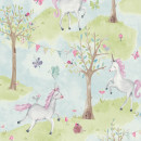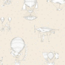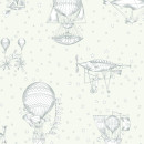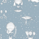 Загадочные путешественники на больших воздушных шарах и летательных аппаратах причудливых форм по-настоящему увлекают, заставляя всматриваться в каждую деталь; забавные динозаврики; пушистые облачка и капельки, а также волшебные единороги, прогуливающиеся по волшебной роще, выполненные в акварельной технике, создают спокойный, но увлекательный интерьер, развивают у ребенка фантазию и интерес к миру.