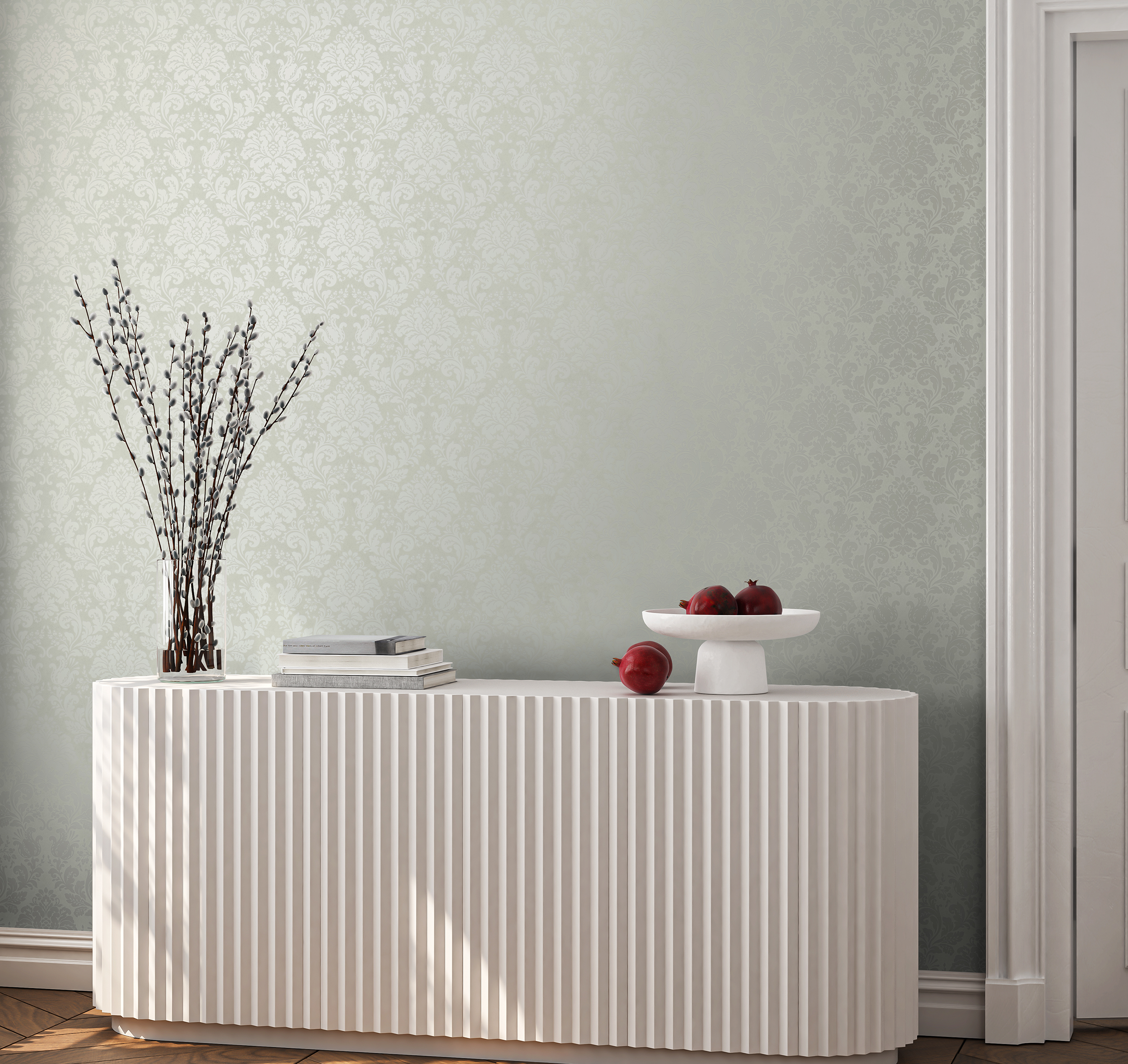 Этот мотив объединяет эффект матового фона с деликатным перламутровым вкраплением и изящным дамасским орнаментом. Дамаск выполнен ненавязчиво: он базовый и спокойный, но при свете оживает благородным переливом. Прием отсылает к традициям златоустской гравюры, где каждая деталь сияла в игре света. Такой узор придает интерьеру статусность и утонченность, раскрываясь во всей своей глубине при каждом новом взгляде.