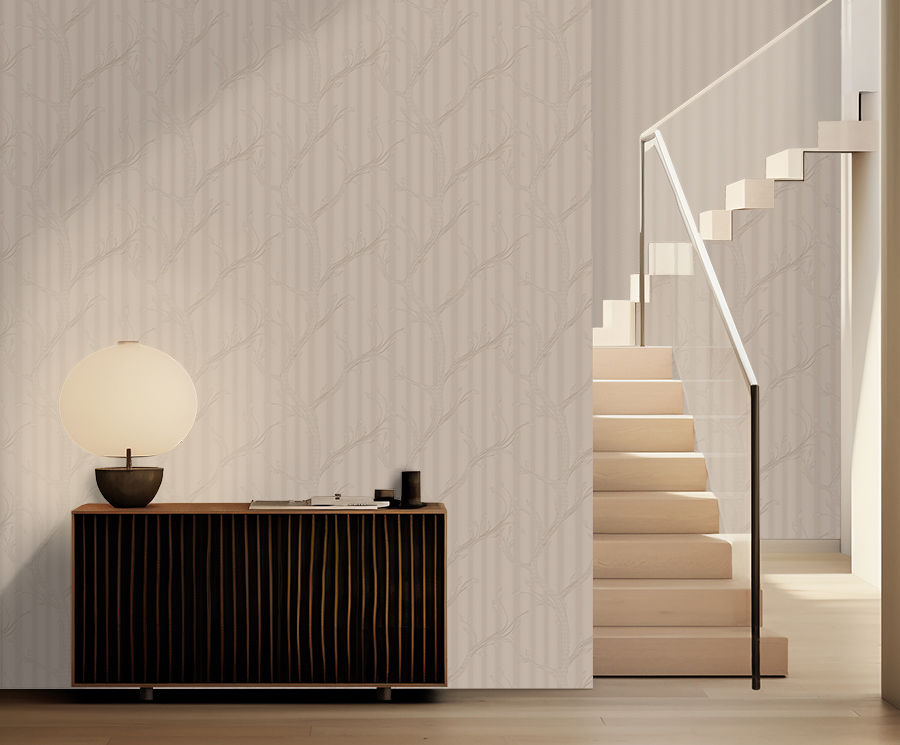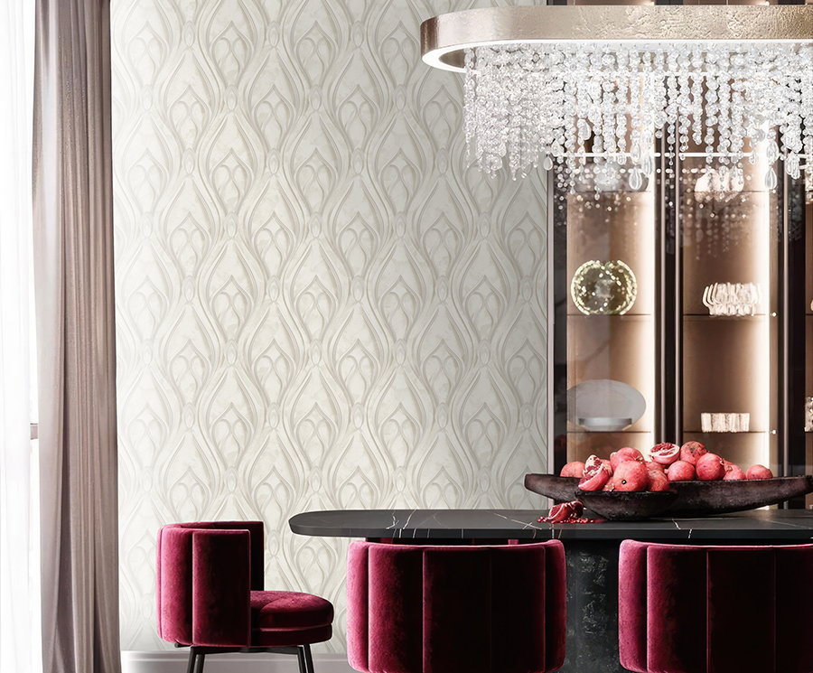 Шелковистая, слегка сияющая поверхность обоев деликатно отражает свет, наполняя пространство глубиной и теплом. Плавные линии вневременных цветочных и дамасских орнаментов, переосмысленных в современном ключе, создают ощущение движения и изящества — словно узоры рождаются прямо на стенах, мягко обрамляя интерьер.