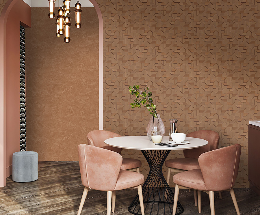 В коллекции представлены роскошные фактуры под текстиль и декоративную штукатурку с глубоким рельефом и сложной игрой света. Их поверхность выглядит дорого и тактильно выразительно, добавляя интерьеру объём, тепло и статусность.