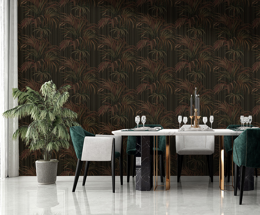 Экзотические и растительные принты раскрывают другую сторону коллекции — чувственную и атмосферную. Глубокие тёмные фоны, тропическая листва, насыщенные оттенки терракоты, зелени, золота и вина создают интерьер с настроением премиального бутик-отеля — яркого, стильного и запоминающегося.