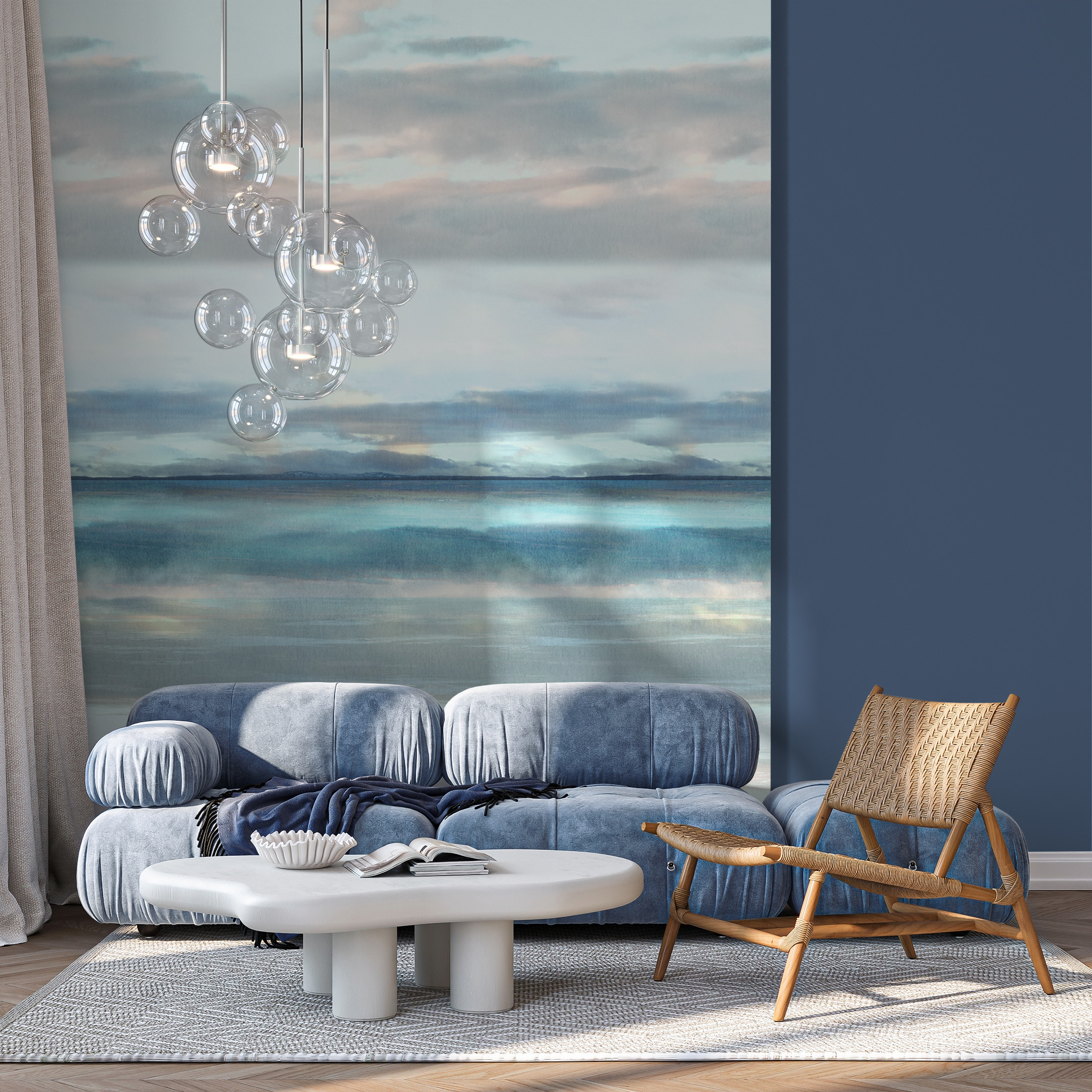 Умиротворённая морская панорама с мягкими, едва уловимыми переходами цвета. Она словно фиксирует мгновение тишины на линии горизонта, где вода и небо сливаются в единое целое. Композиционное решение предаёт чувство глубины и внутреннего покоя, наполняя пространство ощущением простора и равновесия.