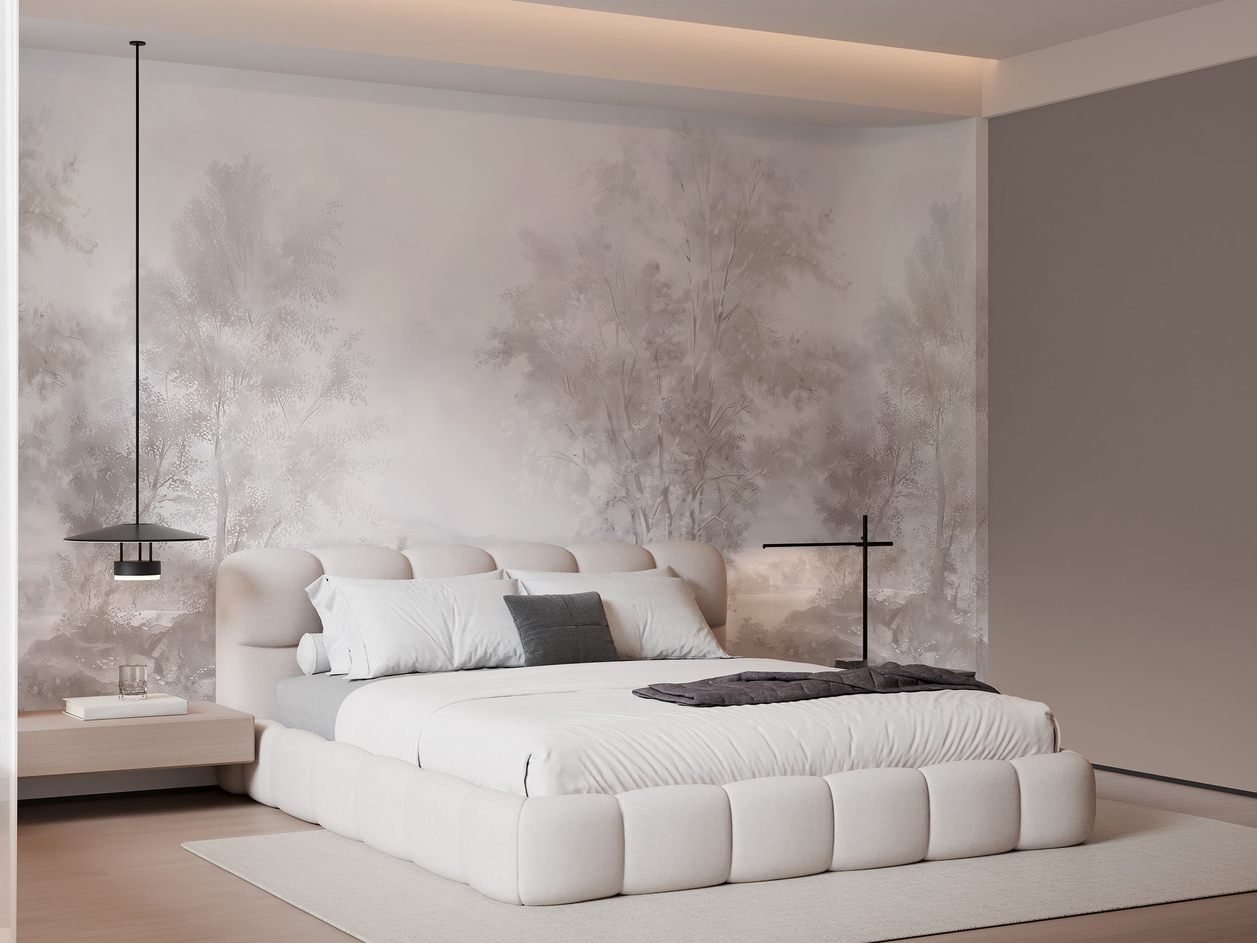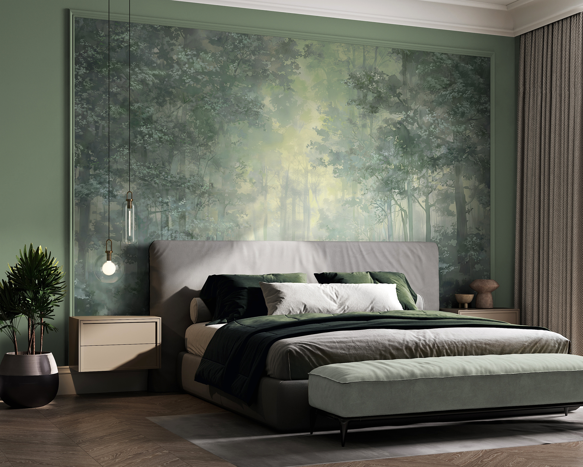 Лесной пейзаж, наполненный глубиной и тишиной, словно окутывает пространство свежим утренним воздухом. Сквозь кроны мягко проникает рассеянный свет, создавая ощущение покоя и уединения. Богатая зелёная палитра с дымчато-бежевыми градиентами выглядит естественно и благородно, напоминая о флоре деревьев, мхе и тумане раннего утра, и наполняет интерьер чувством природного равновесия.