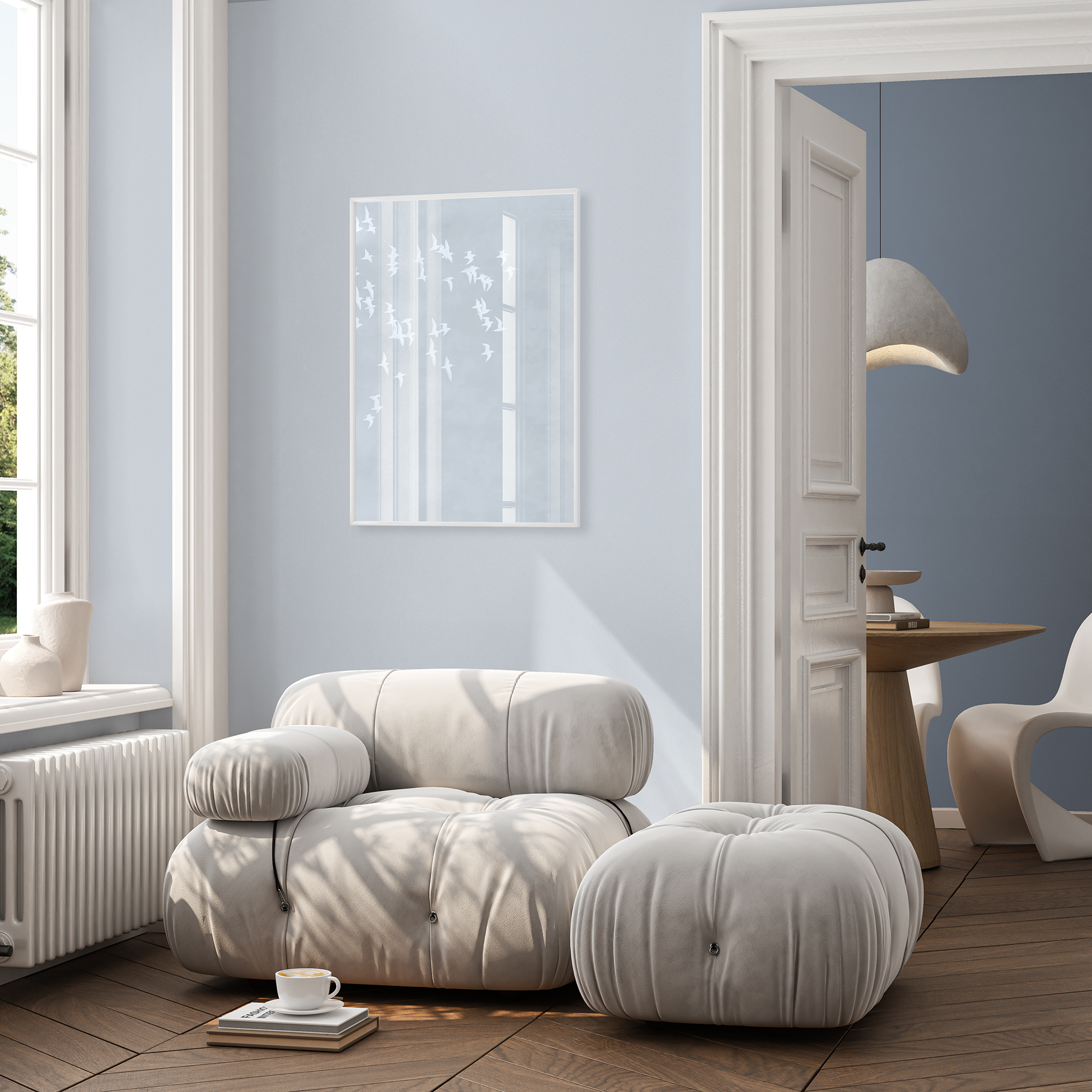 Воздушная акварель, в которой облака будто растворяются в пространстве, формируя ощущение эфирной лёгкости и бесконечности. Этот сюжет работает как атмосферный уголок покоя в интерьере — он расширяет пространство, наполняет его дыханием и мягким сиянием. Цвет панно напоминает весеннее небо — чистое, спокойное, наполненное светом и ощущением обновления, создавая атмосферу свежести и визуального баланса.