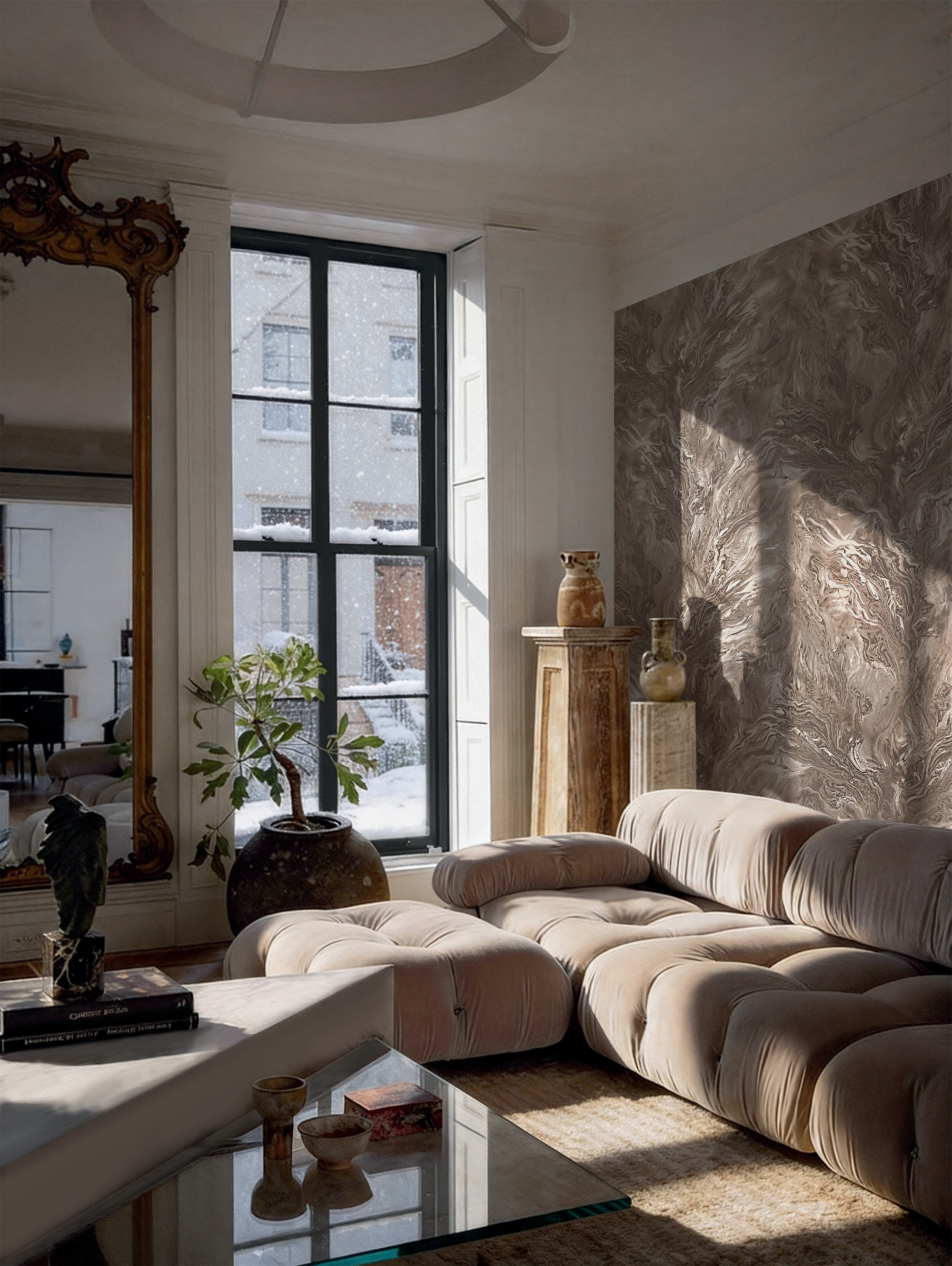 Мотивы с эффектом мрамора добавляют пространству благородства и лёгкой прохлады. Их мягкие прожилки выглядят естественно и ненавязчиво, придавая стенам изысканный и современный характер.